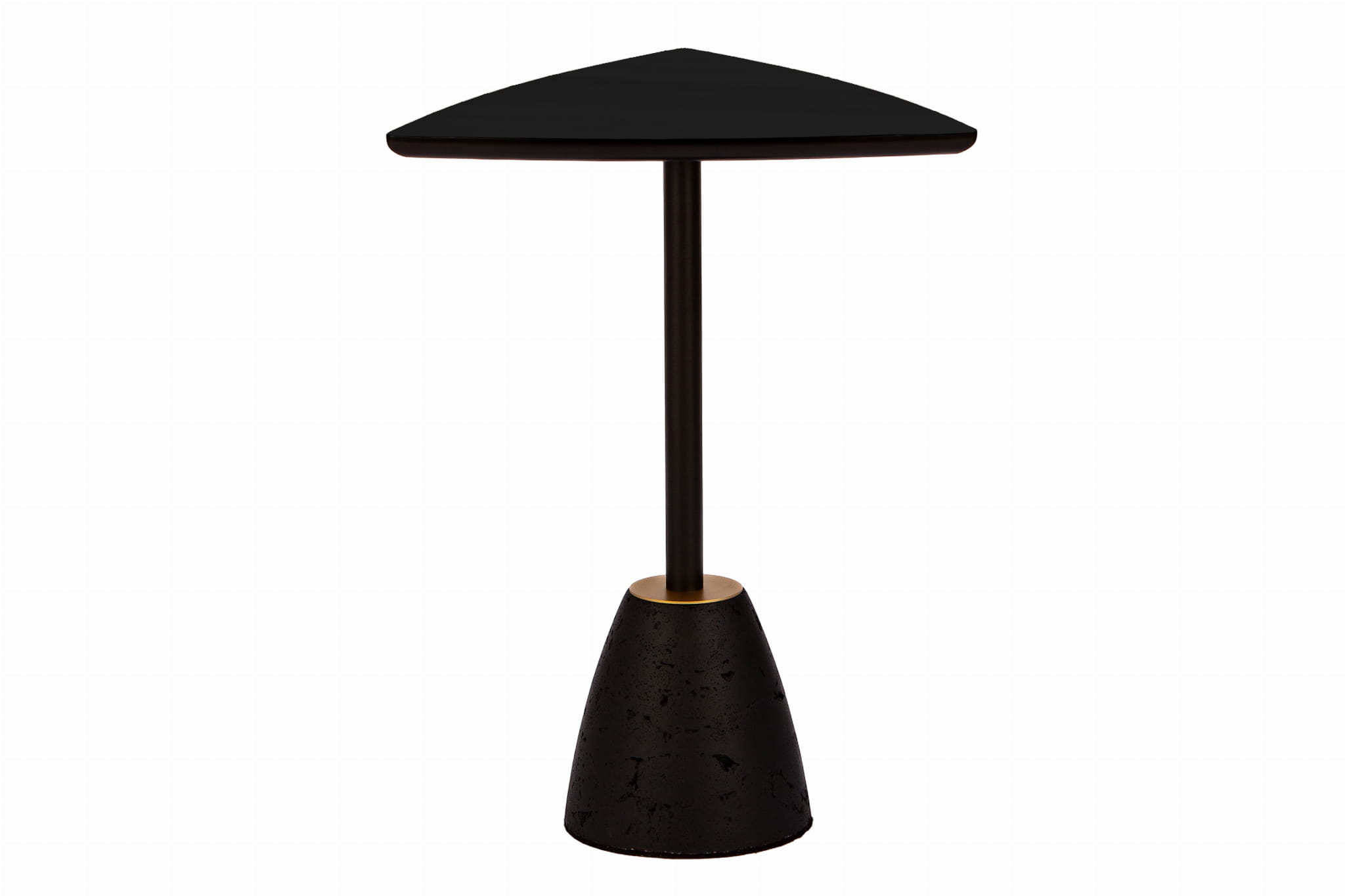 - Design: Trójkątny blat z zaokrąglonymi rogami, wsparty na metalowej rurce malowanej na czarno RAL 9005 w drobnej strukturze, zwieńczony podstawą z betonu ze złotym akcentem przy łączeniu