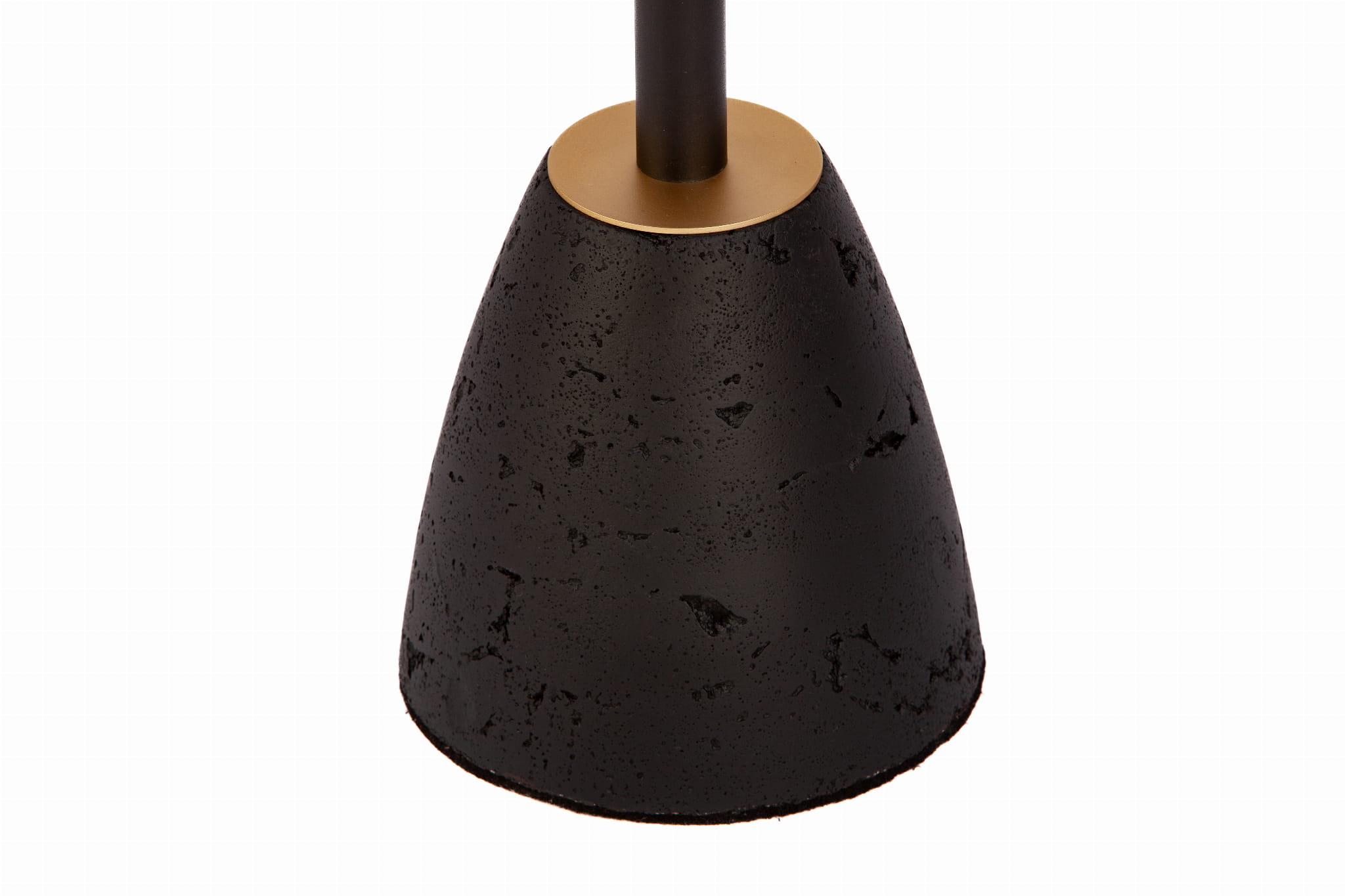 - Design: Trójkątny blat z zaokrąglonymi rogami, wsparty na metalowej rurce malowanej na czarno RAL 9005 w drobnej strukturze, zwieńczony podstawą z betonu ze złotym akcentem przy łączeniu